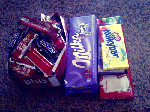 O meu pai apareceu-me ontem cá em casa com isto. Oh Deus... Era mesmo o que eu precisava agora, mil chocolates para engordar. Eu por mim comia todos, não me importava. Mas a minha (mais ou menos) boa forma física não ia achar muita piada. Posto isto, e antes que comece a rebolar, é melhor mantê-los bem afastados de mim. Se quiserem algum digam. Eu não gosto nada disto mesmo... Não me custa dar. E quanto mais longe estiverem melhor!